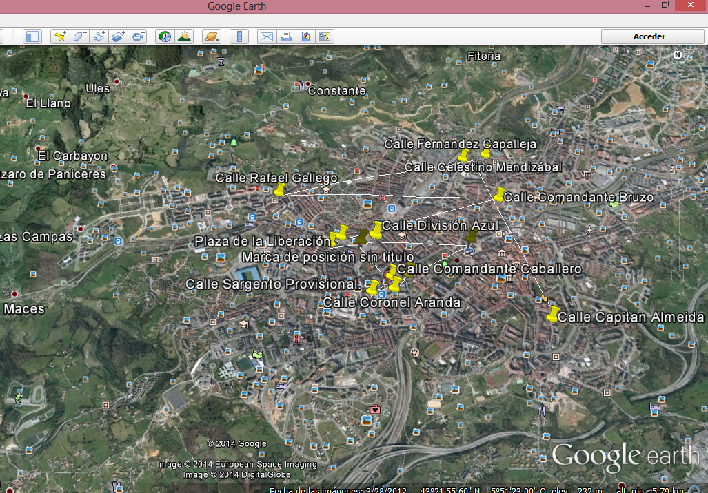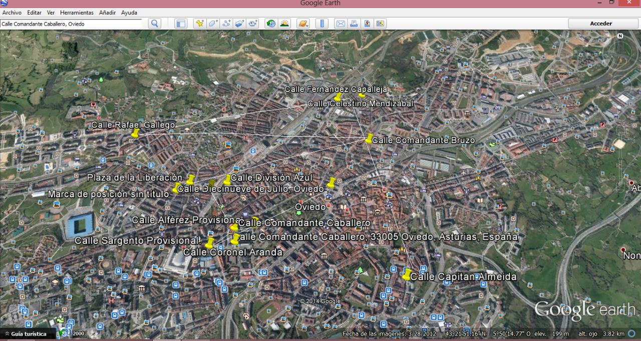 En 2007 el Ayuntamiento de Oviedo creo una comisión de Memoria Histórica que se encargaría de hacer un estudio del callejero de la ciudad para identificar las calles con pasado franquistas. Vamos a ver estas calles a través del callejero de Google Earth: